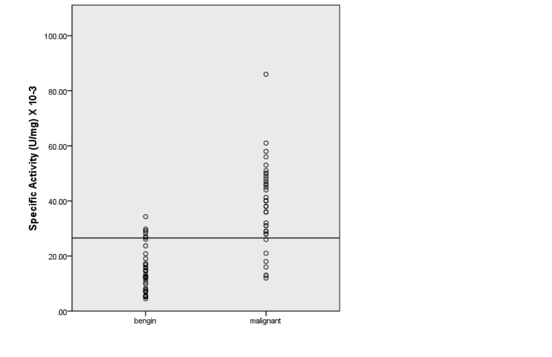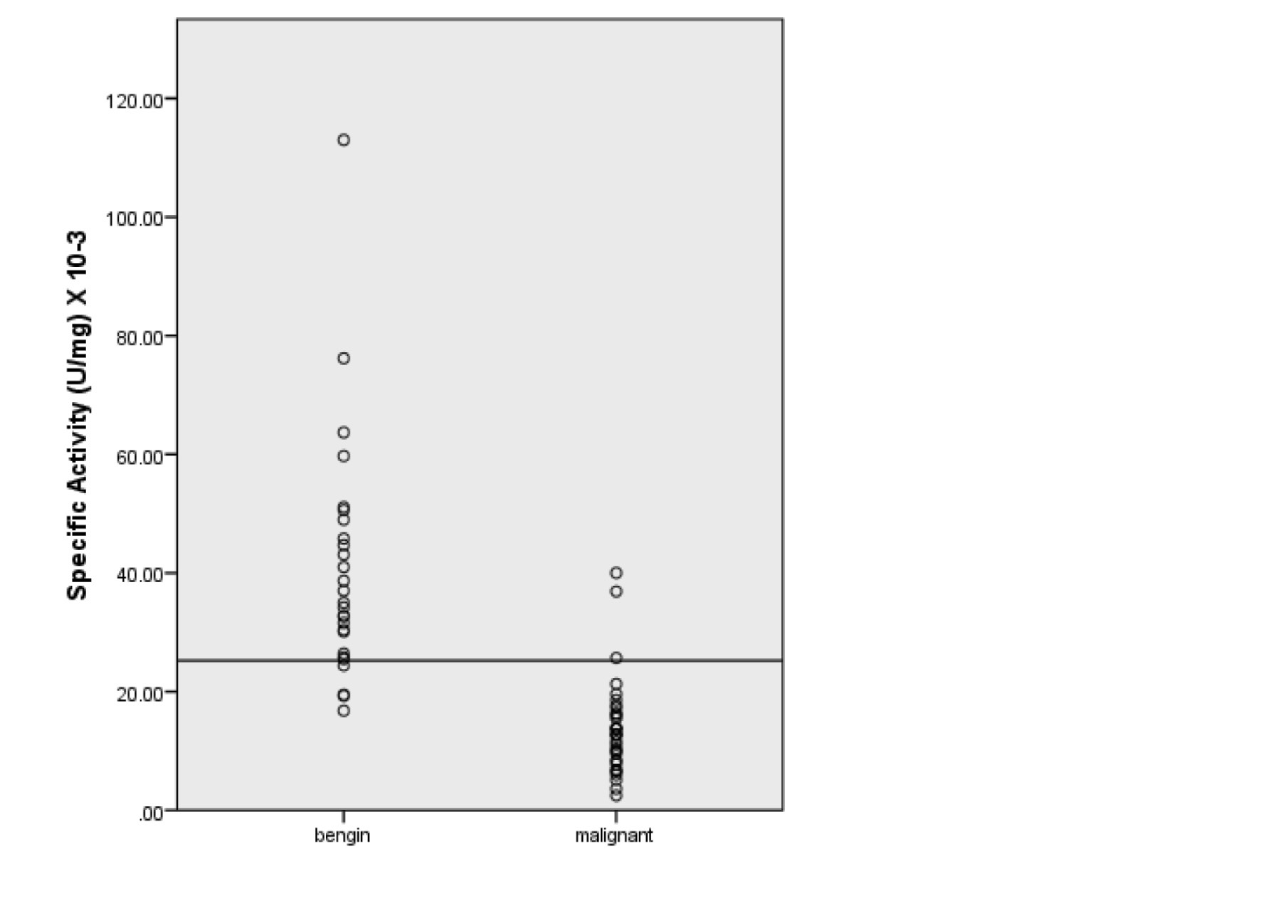 Figure 1 Distribution figure of 5′-NT specific activity for benign & malignant breast tumors.