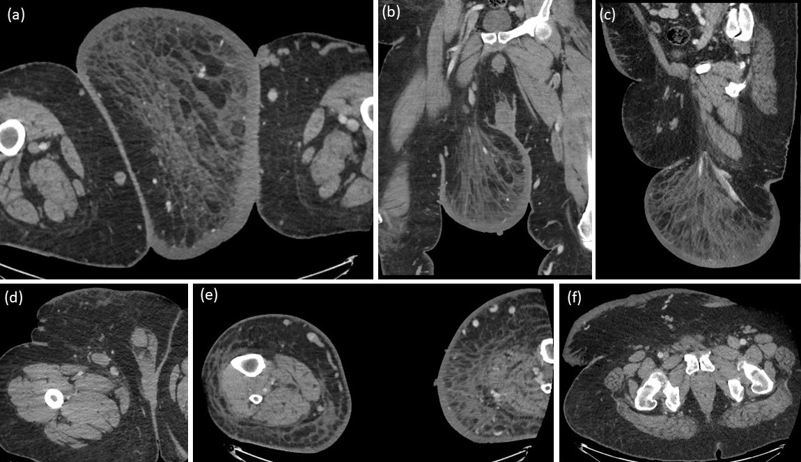 Radiologically, the CT and MRI appearance of the lesion resembles a large pendulous mass of adipose tissue, devoid of fascial or muscle involvement. This directly correlates with the histopathological findings of dermal fibrosis, edema, and fat partitioned by fibrous septae. Specifically, edema tracks along the fibrous septa in a lace-like pattern, accompanied by associated dermal thickening. Contrast administration reveals only mild enhancement in the dermis, consistent with the features observed in lymphedema [9-11].