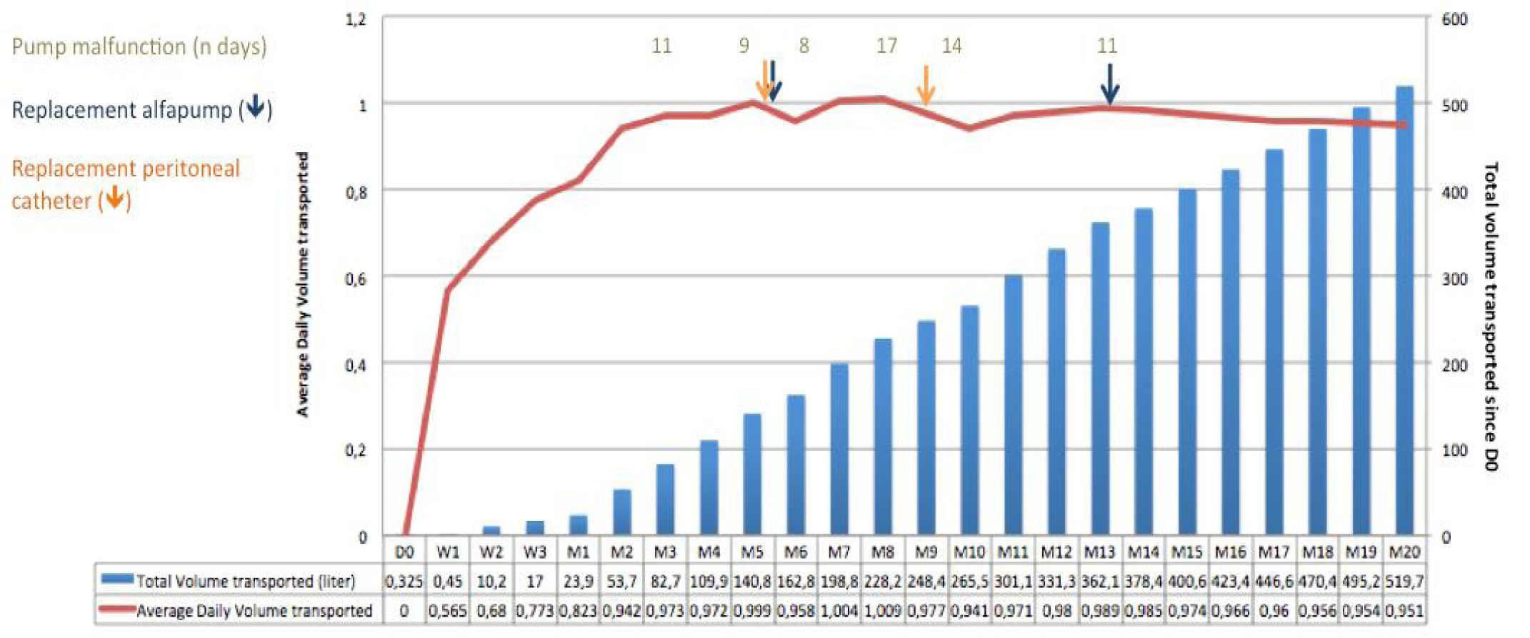 Alfapump malfunction occurred in 12.9% and 2.3% of the total time 20 months follow up, respectively in patients 1 and 2. Malfunction could be self limiting, due to omentum aspiration by the peritoneal catheter. However, when the omemtum is aspirated by the catheter and reaches the pump, the pump is set to crush it. Despite this algorithm, the pump was changed two times for a complete blockage in patient 1. In a less damaging way, omemtum can block only the peritoneal catheter requiring his replacement. A new designed peritoneal catheter was implantated at last exchange in patient 1, avoiding all pump malfunction after. For patient 2, no catheter or pump exchanges were necessary.