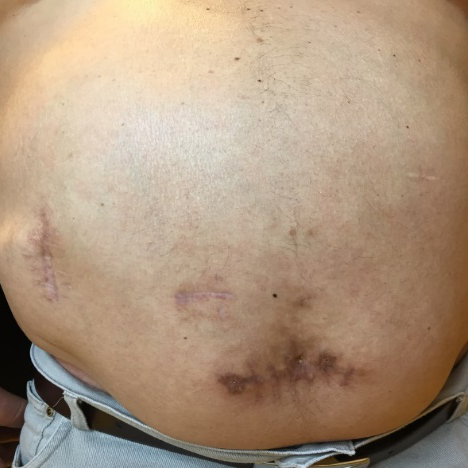 A 54-year-old man (BMI 24.2) had alcoholic cirrhosis Child-Pugh B7 since 2006. Large esophageal varices developed in 2008, treated with propanolol. In 2009, moderate ascites was treated with diuretics, complicated by spontaneous bacterial peritonitis. In 2013, he had bowel obstruction, related to strangulation of an umbilical hernia with massive ascites. The patient was hospitalized in the intensive care unit for treatment of renal failure with vasoactive amines and fluid replacement; subsequent surgical repair of the hernia by omphalectomy and placement of a peritoneal drain was performed. That drain was removed on day 13 and the patient was discharged on day 19. From 2013 to 2015, the ascites became refractory to high doses of diuretics (furosemide 80 mg a day, spironolactone 150 mg a day), required repeat paracentesis of 7 liters every 10 days, resulting in several acute kidney injury, and finaly a recurrence of the umbilical hernia. A transjugular intrahepatic portosystemic shunt (TIPS) had been considered, but was contraindicated, due to pulmonary arterial hypertension. On June 2015, a decision was made to combine implantation of a rechargeable alfapump in the abdominal wall to automatically transport the refractory ascites to the bladder. Surgical repair of the umbilical hernia was performed by placement of an intraperitoneal mesh without a peritoneal drain, during the same operation (Figure 1). Diuretics were discontinued. The alfapump was immediately activated, and the patient was out of bed on day 2, and after education on self-management of the alfapump, he was discharged on day 5. The alfapump daily target flow was gradually increased.