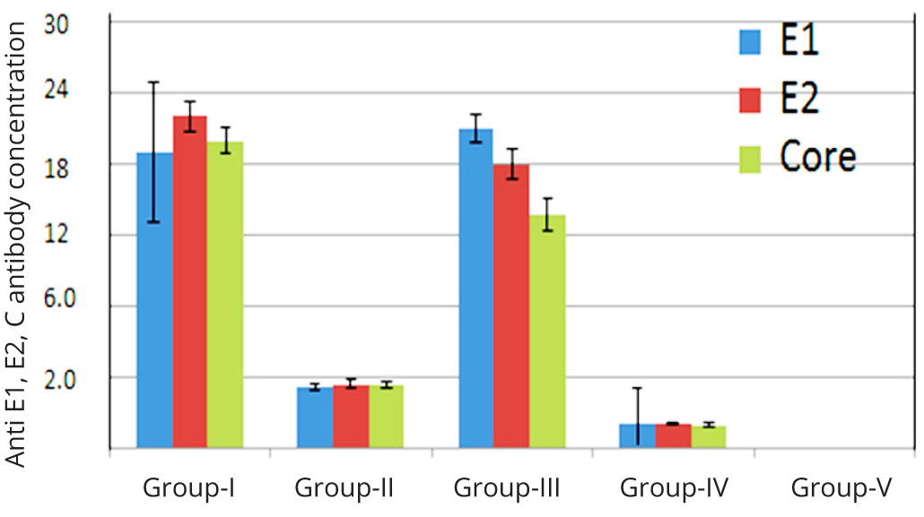 The outcomes OD readings were obtained from ELISA assays for the titer of the free nAbs of anti-core, E1 and E2 antigens in the sera of all examined patients during the three successive samples, showed that, in group I patients which had low viral count (10 × 103 copies/ml ) the levels of their circulating free nAbs was (1.2 - 3.5 ng/ml) while their reference range was (0.02 to 0.05 ng/ml), patients which had a moderate viral load (10 × 104 copies/ml ) the levels of their circulating free nAbs was (5.5 - 12.3 ng/ml) and patients which had high viral count (10 × 105 copies/ml) the levels of their circulating free nAbs was (12.2-20.5 ng/ml), in group II all three samples readings denoted to a decreasing in the levels of the free nAbs (1.1 - 3.0 ng/ml) except for the 4 patients whom relapsed after they achieved SVR for 6 months, their last sample showed an increase in the levels of free nAbs that reached up to (5.7 - 8.9 ng/ml), in group III were all of them had not been previously treated with antiviral drugs the levels of the free nAbs was (4.8 - 7.7 ng/ml), in 40% of them, and (7.0 - 11.9 ng/ml) in the remaining 60%, patients in group IV showed slightly positive for anti E2 and core antigens with a value ranged from (0.07-1.1 ng/ml), while in group V all the examined three samples showed a complete undetectable anti-E1, E2 and core antigens during the study course (Figure 1).