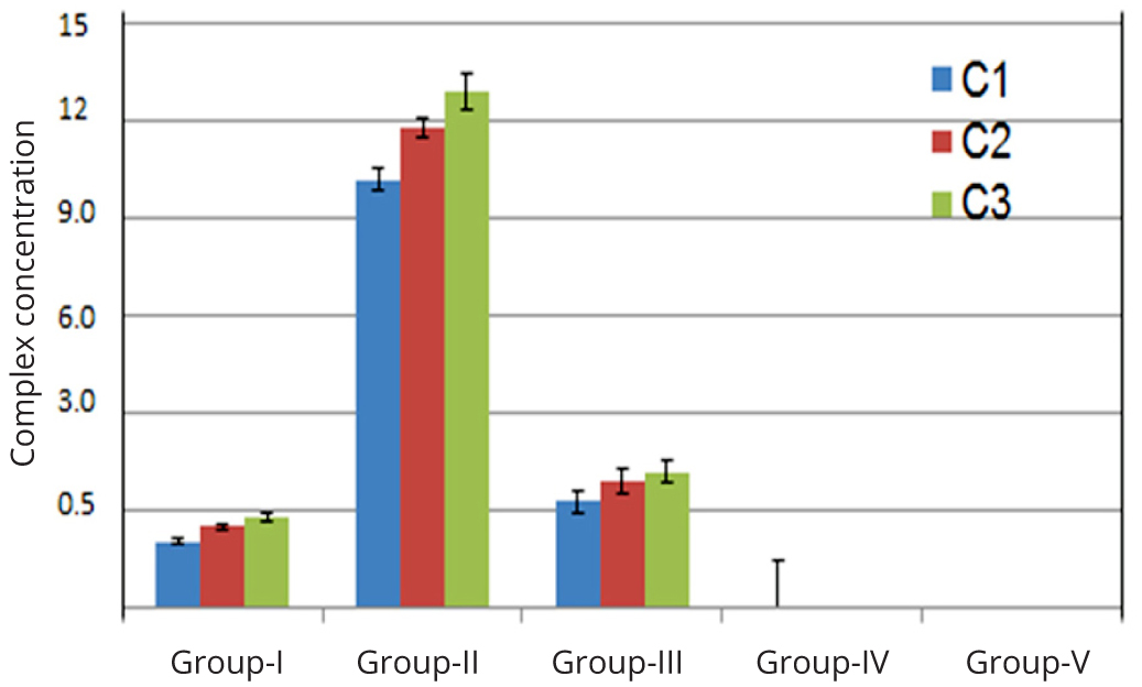 We run the three ELISA assay to detect each specific complex in serum sample for all patients in each group (I, II, III, IV, V). We diluted the complex C1, C2 and C3 standard (Component B) and every examined serum sample with PBS to ten concentrations, then 100 μl of diluted standard, samples were added to the specific well (Component A) of the three designed kits. Incubated at room temperature for at least 1h, dilute 10 μl of anti rabbit IgG (Component C) with 10.5 ml of diluted solution then we added 100 μl of HRP-conjugate to each well. Aspirated and washed four times, and then incubated at room temperature for 30 min, 100 μl TMB peroxidase substrate solution (Component E) was added to the wells, and then it was incubated at room temperature for another one hour, then and each well was estimated at absorbance of 450nm using an ELISA reader (Bioteck, USA). The mean OD readings of complex C1, C2, and C3 were significantly higher than (P < 0.05) which is considered positive among all infected HCV patients.