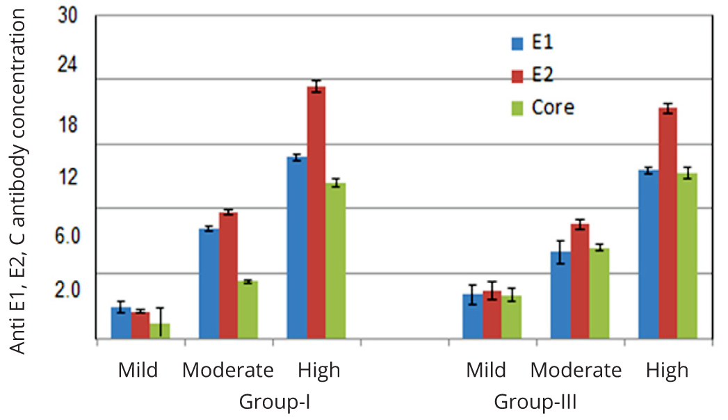Note: Data were presented as mean ± SD. All measured in OD, ANOVA test with pot hoc Tukey test-homogenous groups had the same symbol (a, b, c): E1, E2 and c were significantly highest in high viremia, followed by moderate, and least in low vireamia, C1, C2 and C3 were significantly highest in low viremia, followed by moderate and least in high viremia.