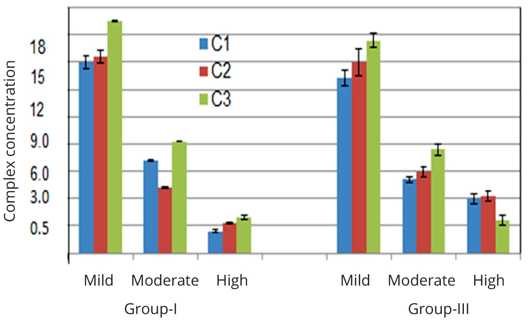 The outcome measures revealed that patients in group I and III with high viral load of serum HCV RNA, the levels of C1 was 0.6-2.1 ng/ml, C2 was 0.7- 1.6 ng/ml and C3 was 1.1- 2.6 ng/ml, patients with moderate viral count their C1 was 2.2-5.1 ng/ml, C2 2.7- 4.6 ng/ml and C3 was 3.1- 7.0 ng/ml, while patients with mild viral load their C1 was 5.7-9.0 ng/m, C2 was 6.1-10.2 ng/ml and C3 was 4.8-9.5 ng/ml. In patients of group II the quantity measure of the immune complex of the three successive samples revealed that C1 was 7.6-11.6 ng/ml, C2 was 8.2- 13.0 ng/ml and C3 was 9.4 -14.8 ng/ml except the 4 patients which showed a relapse after 48 weeks the levels of their three complex showed severe decrease in the level of their complex, were C1 was 0.9-1.2 ng/ml, C2 was 1.0-1.8 ng/ml and C3 was 1.2-2.1 ng/ml (Figure 2), in group IV all the results showed undetectable absorbance readings for C1, C2 and C3 in comparing its results with the group V, the results that shows the levels of anti- E1, E2, c and the immune complex C1, C2, C3 regarding the levels of HCV copies (Tables 2 and 3) (Figures 3 and 4) (NB. The patients considered positive if their OD reading yielding absorbance over 0.05 ng/ml).