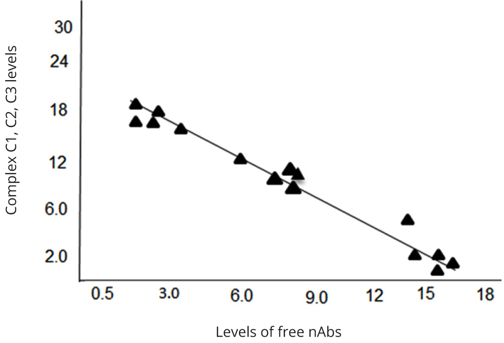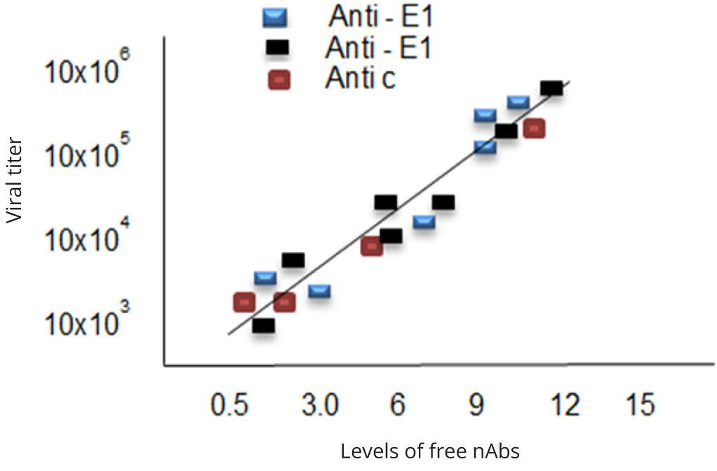 Correlations between the quantity of free anti-E1, E2, core antibody and the complex C1, C2, C3