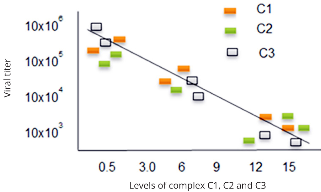 Investigating the last correlation between the levels of the circulating immune complex C1, C2, C3 and the viral count a positive correlation between the decrease in quantitative measure of the immune complex and the increase in the titer of viral count, consequently a decrease in viral count followed by an increase in the levels of circulating immune complex (Figure 7).